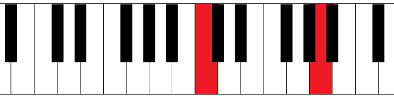 If you count the half-steps from each key in the triad chord above, you’ll notice that walking from the third (i.e., the second highlighted note / [mechanical] key) is the same 3 half-step distance (refer to Scale Degrees and Triadic Chord Construction for more on what a third is). 3 half-steps is a ”minor third¨ distance in a triad chord.