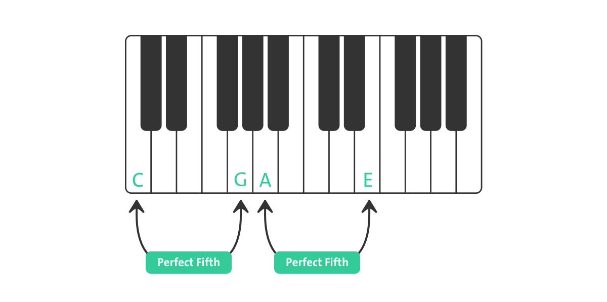 Examples of perfect fifths in the key of C Major scale (refer to 20240901171406-Musical_Intervals, 20240903174948-Being_“In_Key” & 20240904103821-Musical_Scale_and_Key_Patterns):