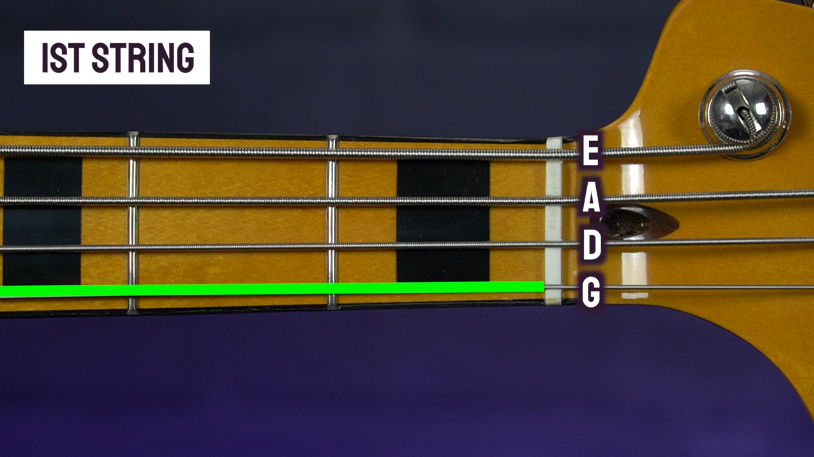 As apparent in the video, “1ST STRING¨ on the top-left corner of this image corresponds to the string on this bass guitar that has the green stroke over it.