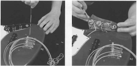 - “[R]un the new wires back to the controls that the old pickups were attached to,¨ ensuring the wires are “the proper length¨ and “cutting and stripping¨ the wires for careful re-soldering “onto the old connections¨