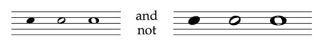 A notehead lacking a fill is known as a white notehead, and a notehead that has a fill is known as a black notehead (Gould 2011, 9). A slanted white notehead with a stem that has nothing attached to it is a half note or minim (Gould 2011, 10).