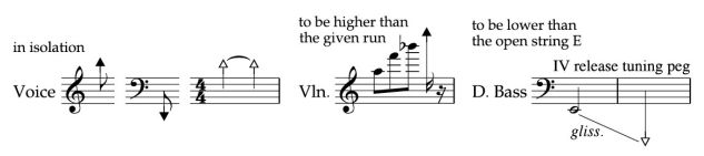 A diamond-shaped notehead–having concave sides and more thickness on its diagonal lines–that can take a stem on its left or right corners can be used to notate non-piano harmonics, silently depressed piano key sounds, singing via wind instrument, sounds requiring unconventional technique on a wind instrument, indicate multiphonics, unvoiced vocals, and optional falsetto (Gould 2011, 11). For string harmonics, diamond-shaped noteheads are always unfilled for bowed string and woodwind instruments while they can sometimes be filled for plucked/strummed string instruments (Ibid).