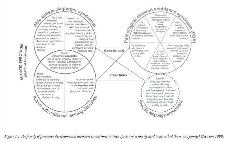 Diagnostic systems and categories, though, as well as showing variation in the way they are used by different professional groups or individuals, are also evolving and developing concepts. […] Newson recognized this when devising a diagram (Newson 1999) to demonstrate how she thought of PDA as a specific disorder that, along with other disorders including autism and Asperger’s syndrome, makes up the ‘family´ of disorders known as pervasive developmental disorders (see Figure 1.1).