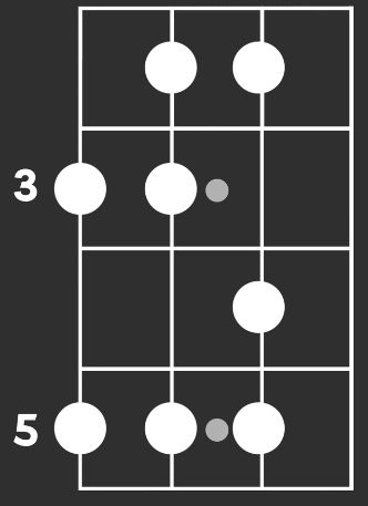 The above is the shape of the Major scale on the root note of G, i.e. the G Major scale, on the bass guitar. This is on the fretboard of the neck of a 4-string bass guitar, where the leftmost is the topmost part of the bass neck (i.e., the lowest pitch string) and the rightmost is the bottom part of the bass neck (i.e., the highest-pitched string) (refer to 20241215165631-Composite_Chordophone_Hardware_Components). It is read from top to bottom, left to right. The dots signify where fingers would be placed. The sequence of the G Major scale corresponds to the order of the dots, as is apparent when mapped to the notes on the fretboard. The vertical numbers on the left indicate the fret number (count starts from the headstock of the bass guitar onwards).