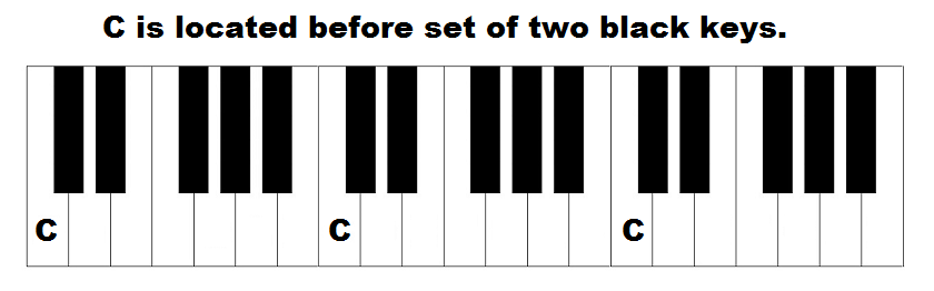 The pitch C will always be the white key to the left of a group of two black keys. […] No matter what kind of keyboard you are looking at it, or what kind of sequencer, the location of C will always be the same. The only difference is that when we look at our Piano Roll Editor, the C is under the group of two black notes (remember that left means lower on the piano), because the piano is laid out vertically.