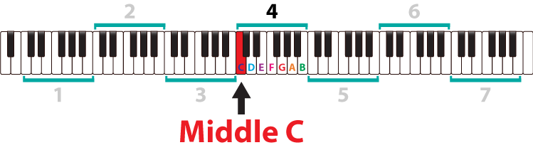 In addition to the letter name C, there is a number. That number indications[sic] which C we are looking at. On a keyboard (depending on the size of the keyboard), we might have six or seven different C keys. […] Middle C is the C key that is right in the middle of the keyboard. Technically speaking, middle C is C4.